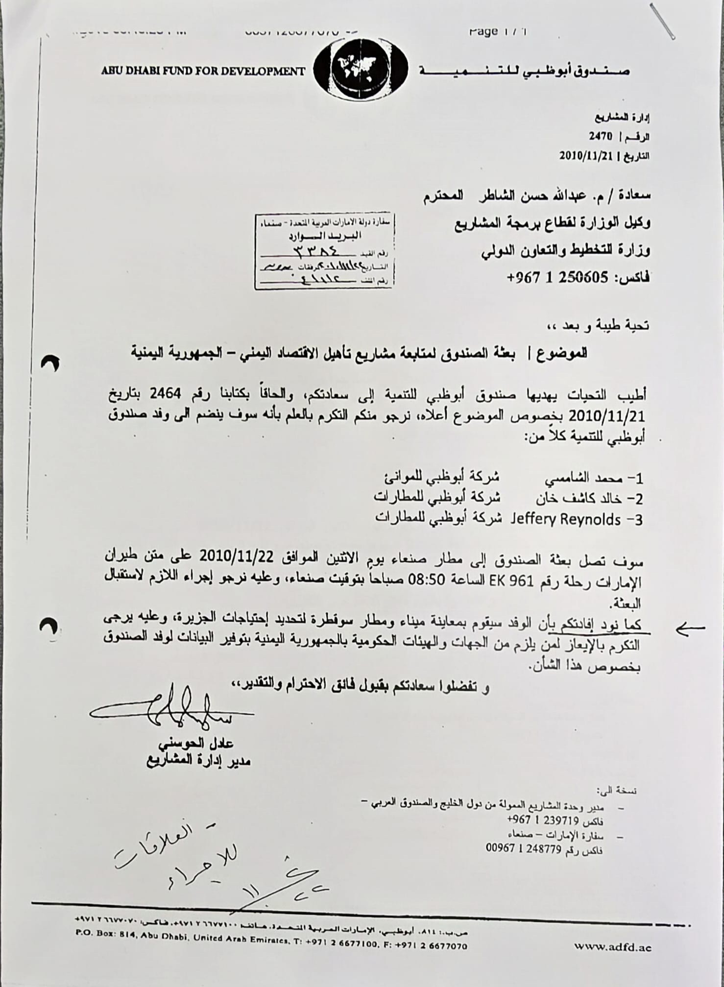 كانت الإمارات إحدى الدول الفاعلة في الملف، لكن أغرب ماحصلنا عليه وثيقة ملفتة، تابعة لصندوق أبوظبي للتنمية، والذي كان مشاركا فيما يعرف بـ (تأهيل الاقتصاد اليمني).