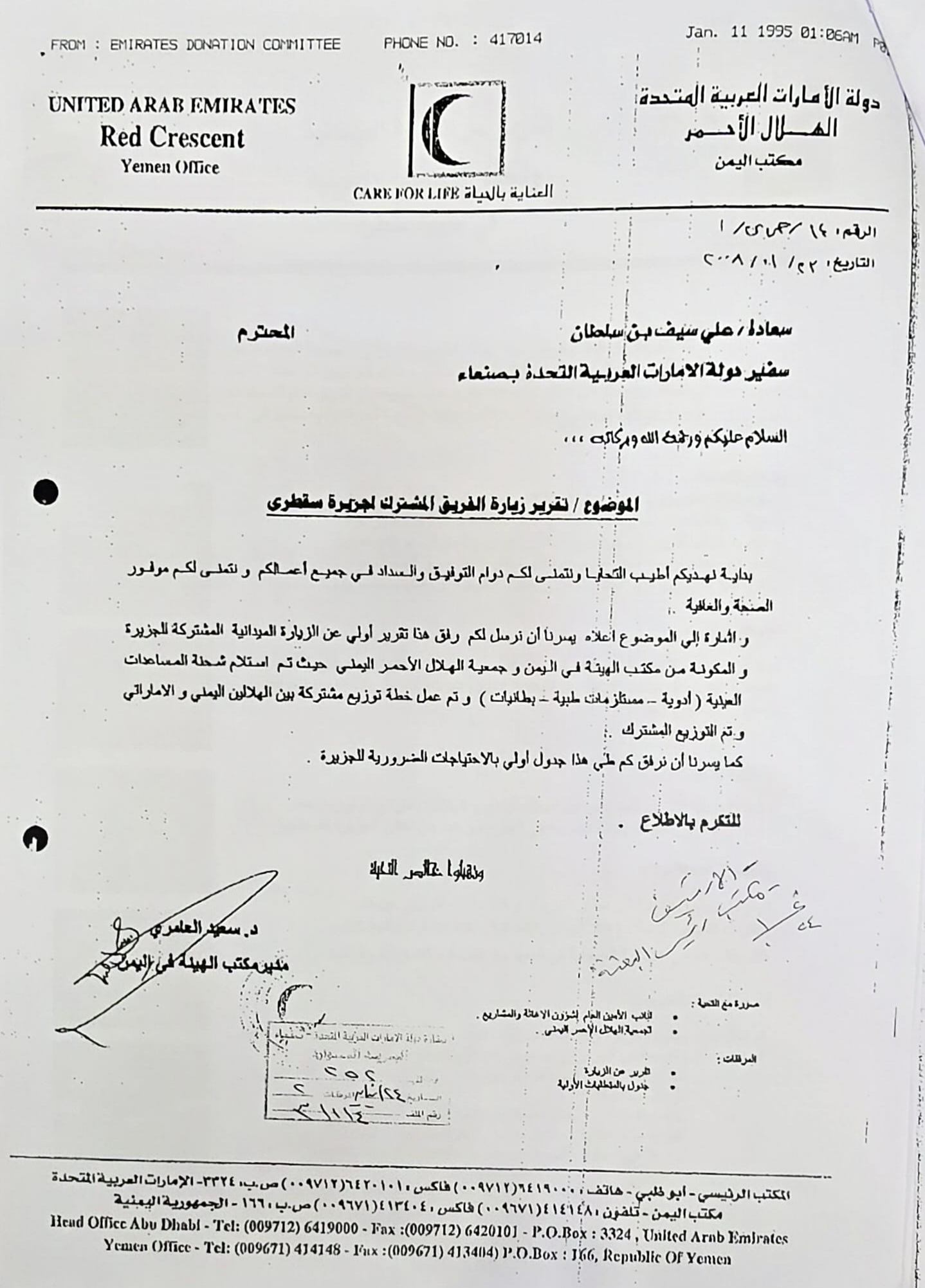 بعد شهرين تماما من تقرير السفير كانت هيئة الهلال الأحمر الإماراتي قد زارت جزيرة سقطرى، وبعث مدير فرعها في اليمن رسالة لسفير الإمارات في صنعاء علي سيف بن سلطان في تاريخ 23 يناير  2008 مرفقة بتقرير عن الزيارة الميدانية المشتركة مع الهلال الأحمر اليمني إلى الجزيرة.