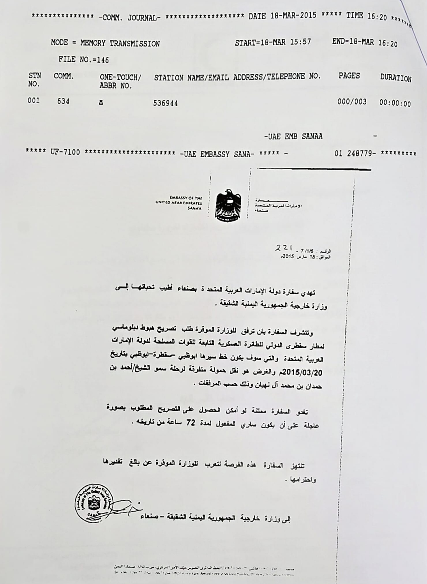 وفي سياق انكشاف الوثائق الخاصة باهتمام أبوظبي بجزيرة سقطرى تظهر رسالة من سفارة الإمارات في صنعاء موجهة لوزارة الخارجية اليمنية في تاريخ 18 مارس 2015 أي قبل عاصفة الحزم بثمانية أيام تتضمن الرسالة طلب تصريح هبوط دبلوماسي للطائرة العسكرية التابعة للقوات المسلحة لدولة الإمارات العربية المتحدة والتي سيكون خط سيرها أبوظبي سقطرى أبوظبي بتاريخ 20 مارس 2015 والغرض هو نقل حمولة متفرقة لرحلة سمو الشيخ حمد بن حمدان بن محمد آل نهيان.