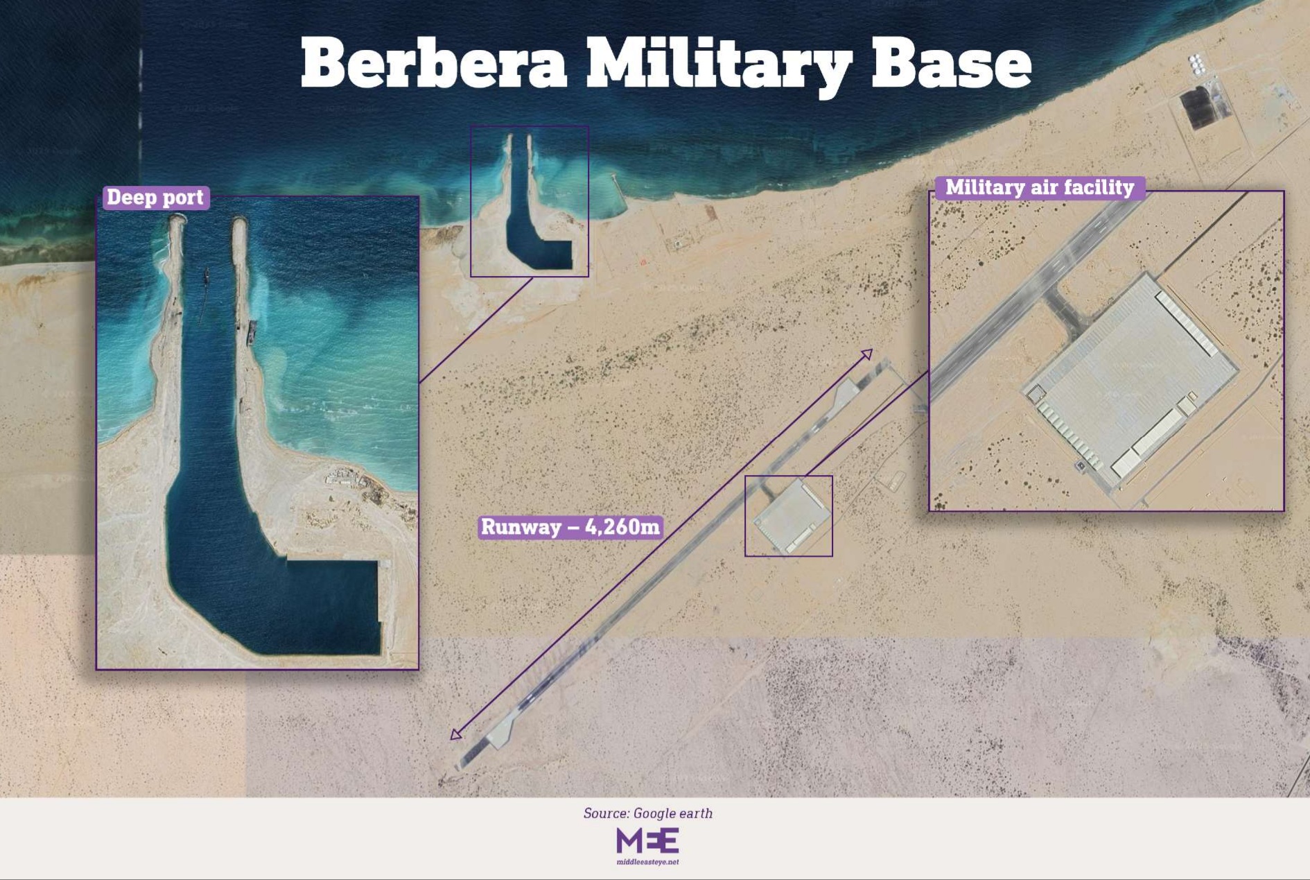 وتُظهر صور الأقمار الصناعية أنه في بربرة، جرى تحويل القاعدة البحرية بهدوء من مشروعٍ متوقف إلى منشأةٍ شبه مكتملة، مع بنيةٍ تحتيةٍ متقدمة تشمل ميناءً عسكريًا حديثًا، ورصيف مياهٍ عميقة، ومدرجًا جويًا مع هناجر ومرافق دعمٍ كاملة الإنشاء.