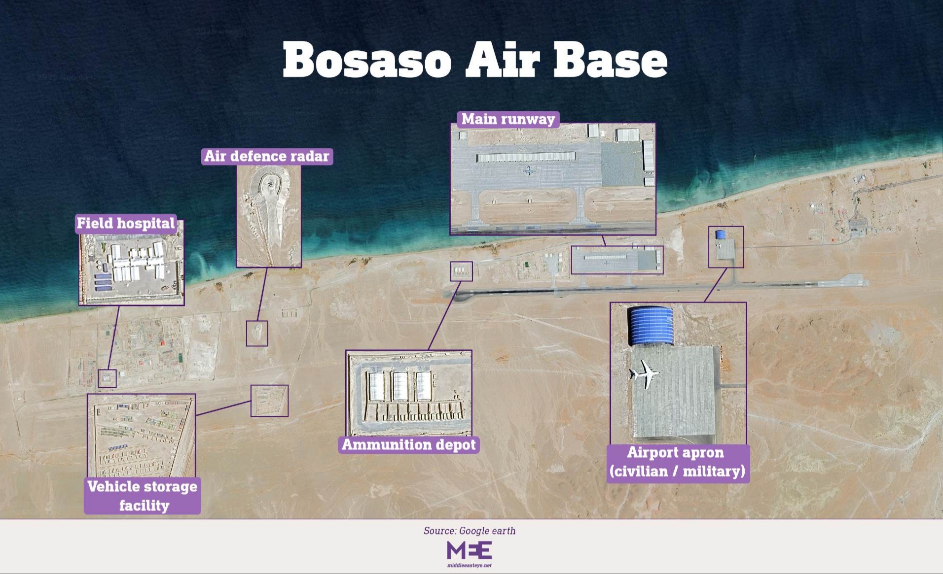 وقد جرى بناء أو توسيع قواعد عسكرية ومدارج طائرات ومنشآت أخرى في عبد الكوري وسمحة، وهما جزيرتان ضمن أرخبيل سقطرى الذي بات اليوم تحت إدارة المجلس الانتقالي الجنوبي؛ وكذلك في مطاري بوصاصو وبربرة في بونتلاند وأرض الصومال؛ وفي المخا باليمن؛ إضافةً إلى جزيرة ميون البركانية في مضيق باب المندب، الممر الذي يعبر من خلاله نحو 30٪ من نفط العالم.