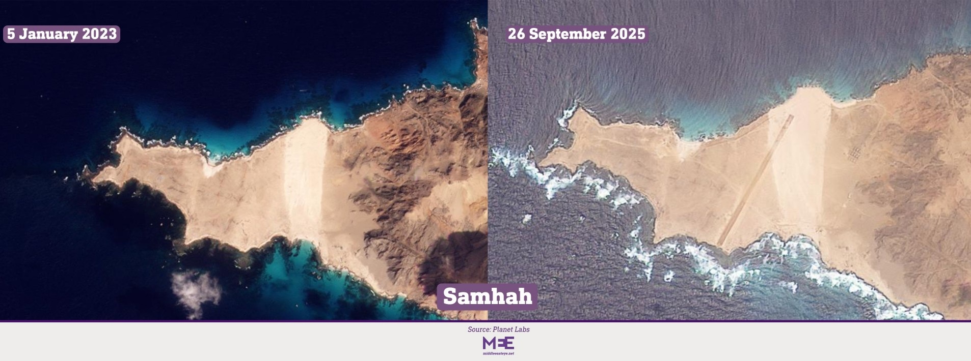 وبين 25 مارس/آذار و4 أبريل/نيسان 2025، كشفت صور الأقمار الصناعية عن ظهور ضفةٍ رمليةٍ مؤقتة على الجانب الغربي من جزيرة سمحة، لم تكن ظاهرة في الصور السابقة التي اطّلع عليها ميدل إيست آي. ويبدو أن هذه الضفة الرملية الصغيرة تكوّنت لغرض صرف مياهٍ مؤقت، وهو نمطٌ شائع في مشاريع البناء العسكرية المعزولة.
