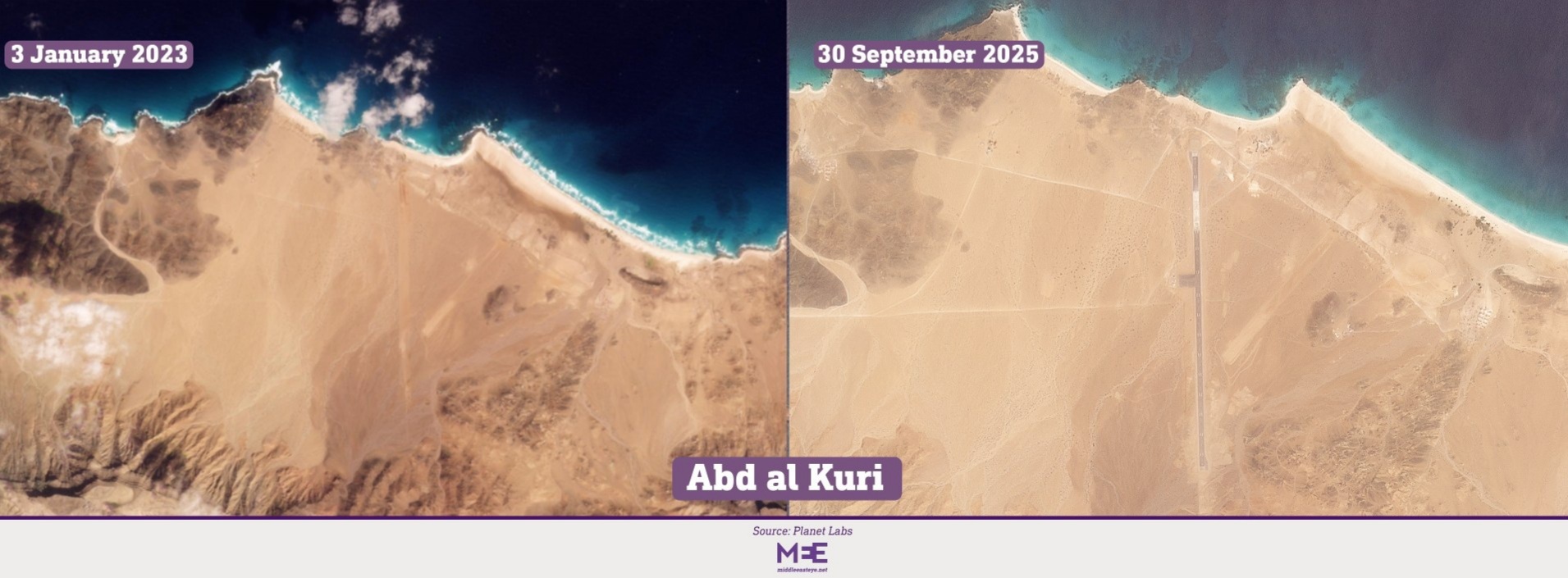 ومن أكتوبر/تشرين الأول 2023، تم إنشاء مدرجٍ جوي جديد بطول نحو 2.41 كيلومتر مع امتدادٍ ترابي يبلغ ثلاثة كيلومترات في جزيرة عبد الكوري. وفي مارس/آذار 2024، أظهرت صور الأقمار الصناعية المنشورة من وكالة أسوشيتد برس كتابة عبارة «I LOVE UAE» بأكوامٍ من الرمال بجانب المدرج.