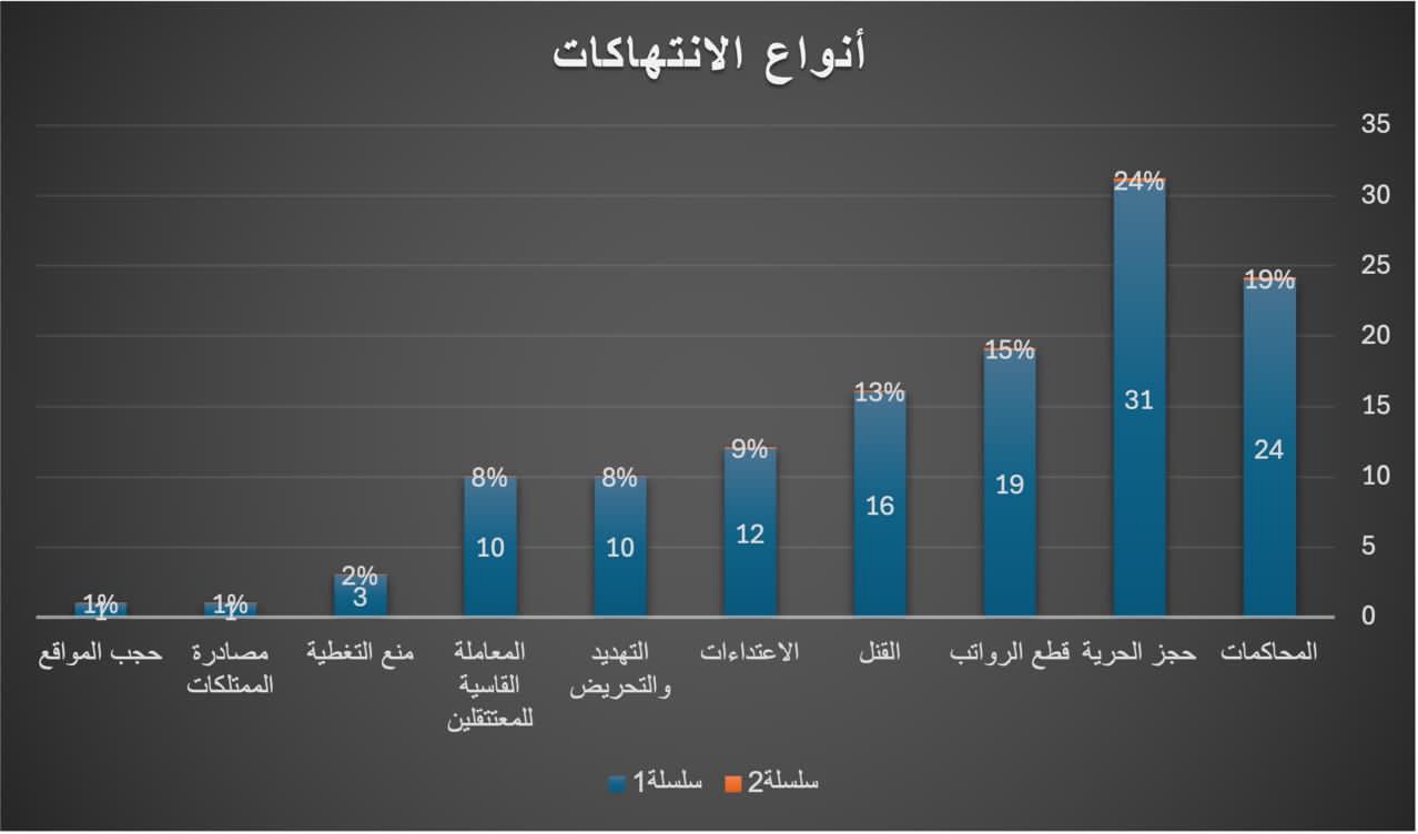 إلى جانب ذلك، أحصى التقرير 12 حالة اعتداء، و10 حالات تهديد وتحريض، و10 حالات معاملة قاسية بحق معتقلين، إضافة إلى حالتي منع من التغطية، وحالة مصادرة مقتنيات، وحجب موقع إلكتروني.